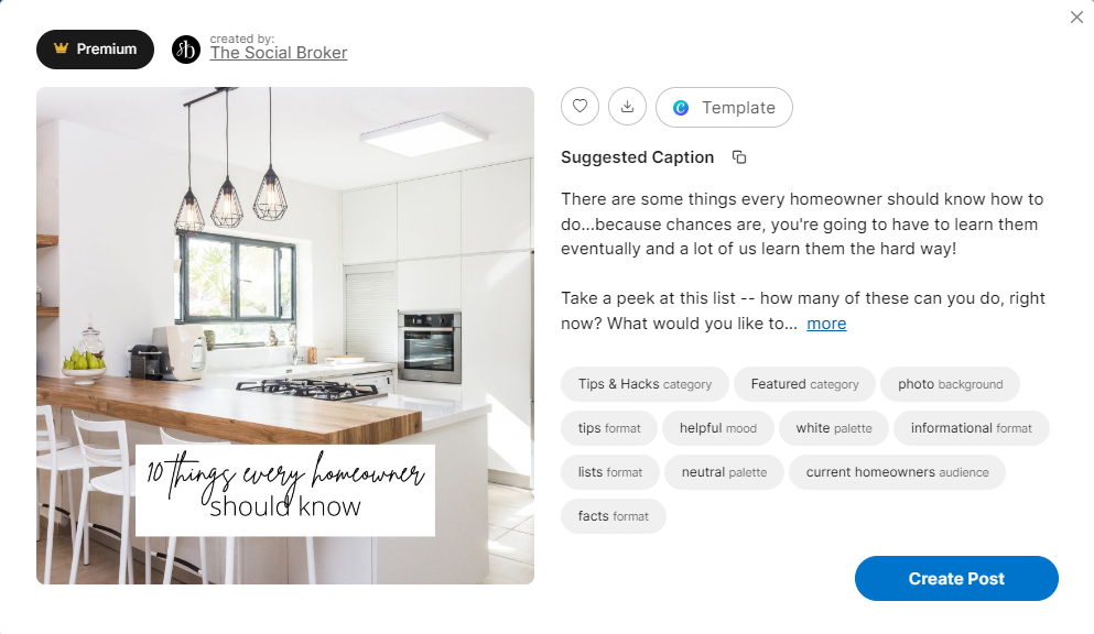 Choose the ready-to-post content you want to publish to one or more of your social pages and click the graphic to access the publishing tools. This opens the preview window. To continue the process, click the blue "Create Post" button for the next steps.