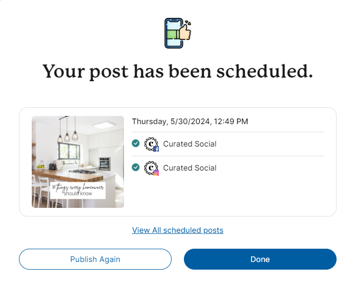After clicking the "Post" button, you'll get to the confirmation screen. From here you can view the post on your page, view all your published posts or "publish again."