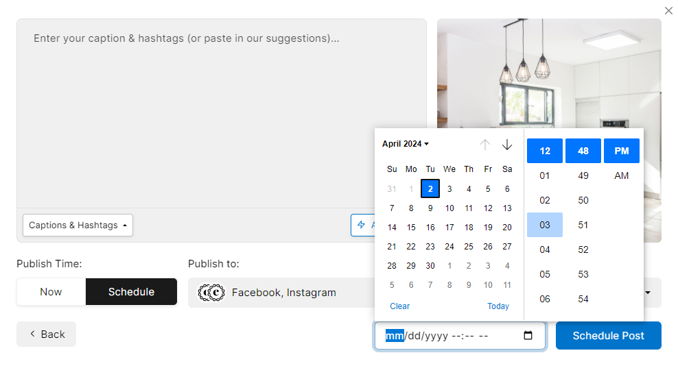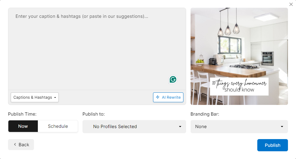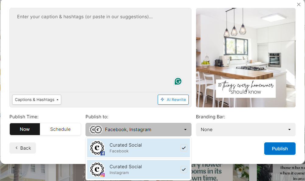 The next screen will have a couple of options depending on how many social profiles you have connected and if you want to edit the provided caption and hashtags.